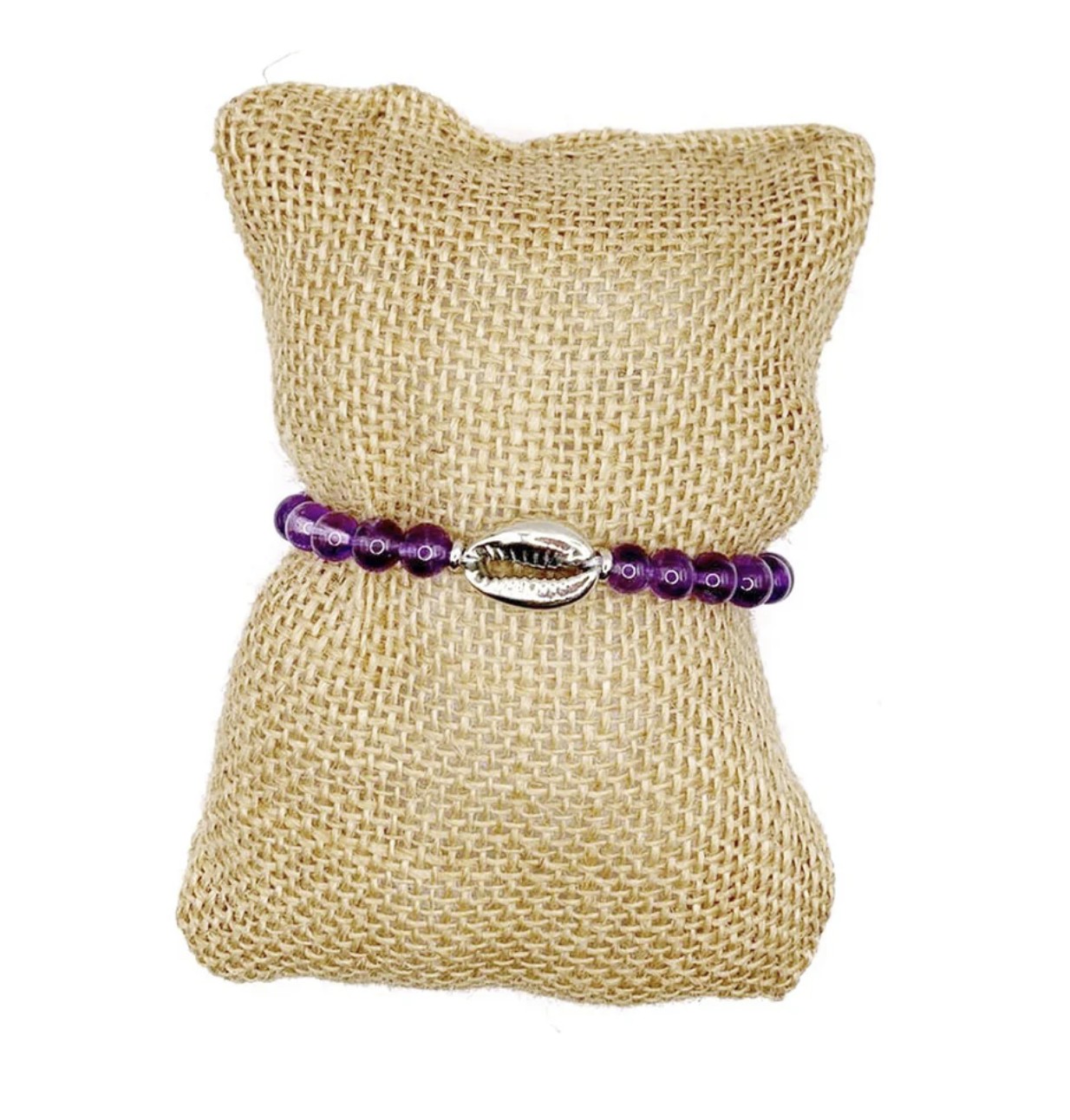 Bracelet Amethyst fait main, composé de perles d’améthyste naturelle (pierre semi-précieuse) et de cauris plaqué argent pour une touche lumineuse et élégante.