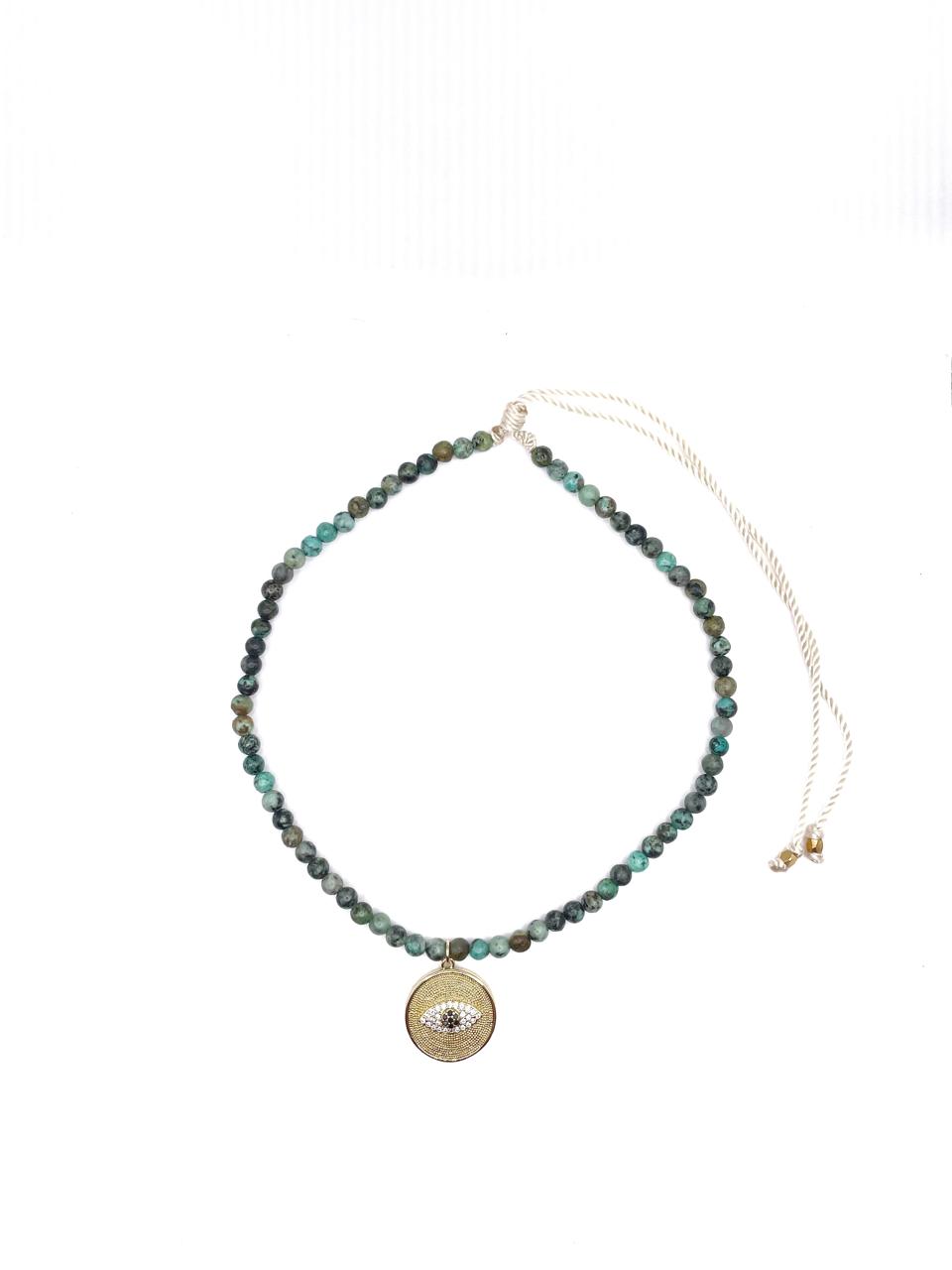Collier en sodalite fait main, orné d’un pendentif œil pavé, idéal à porter seul ou en accumulation.
