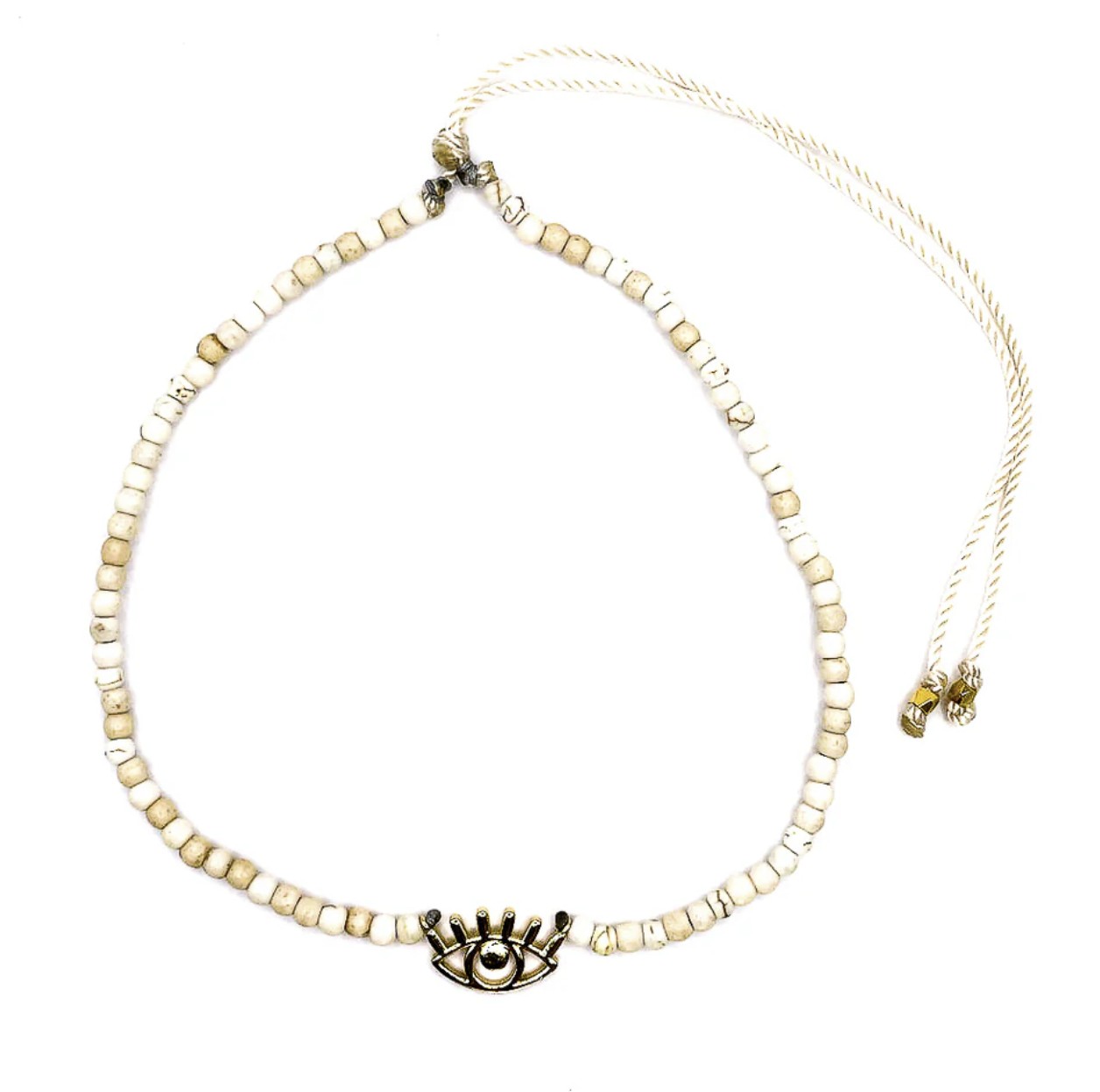 Collier court fait main en howlite crème, orné d’une breloque Evil Eye, doté d’un nœud coulissant pour un ajustement parfait.