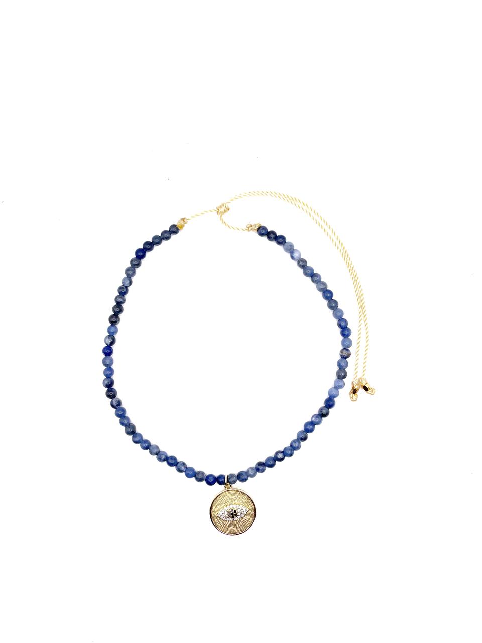 Collier en sodalite fait main, orné d’un pendentif œil pavé, idéal à porter seul ou en accumulation.